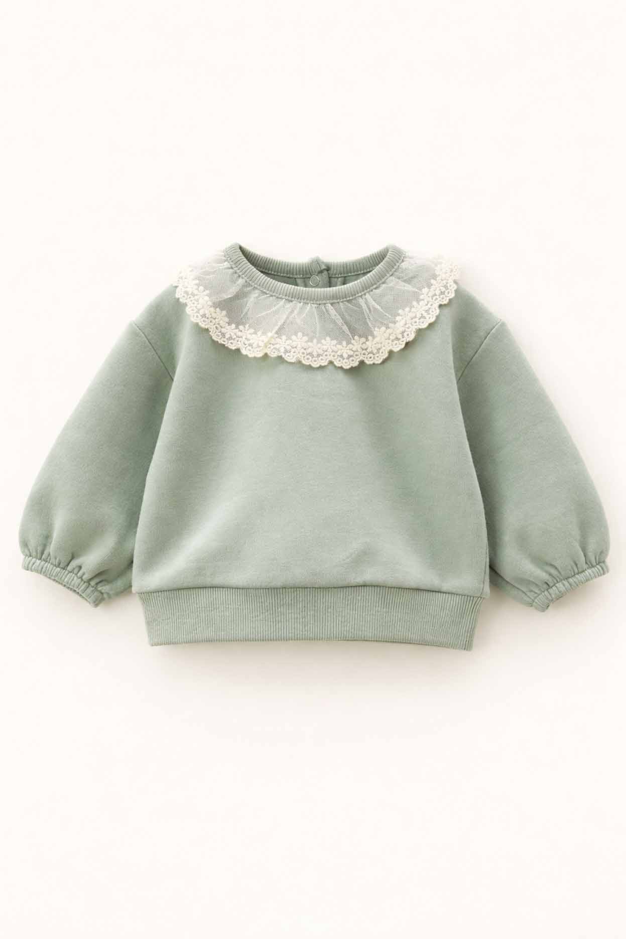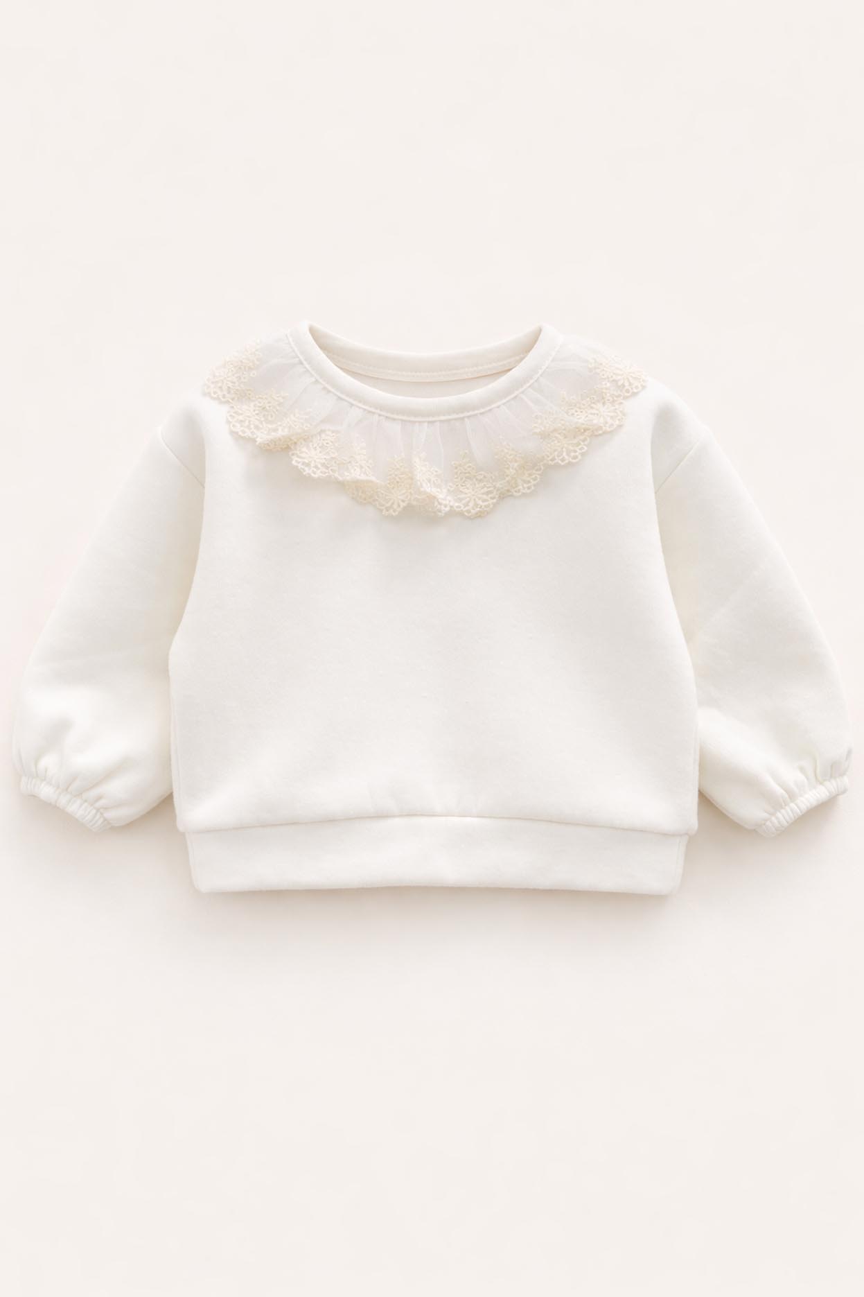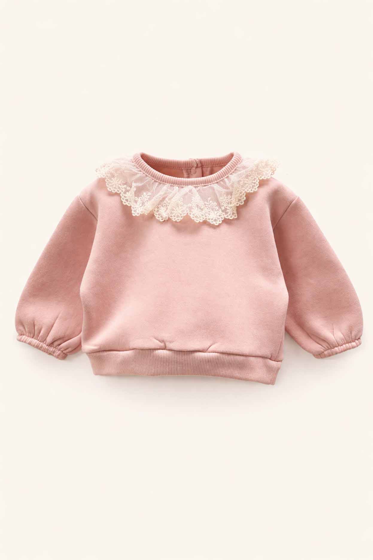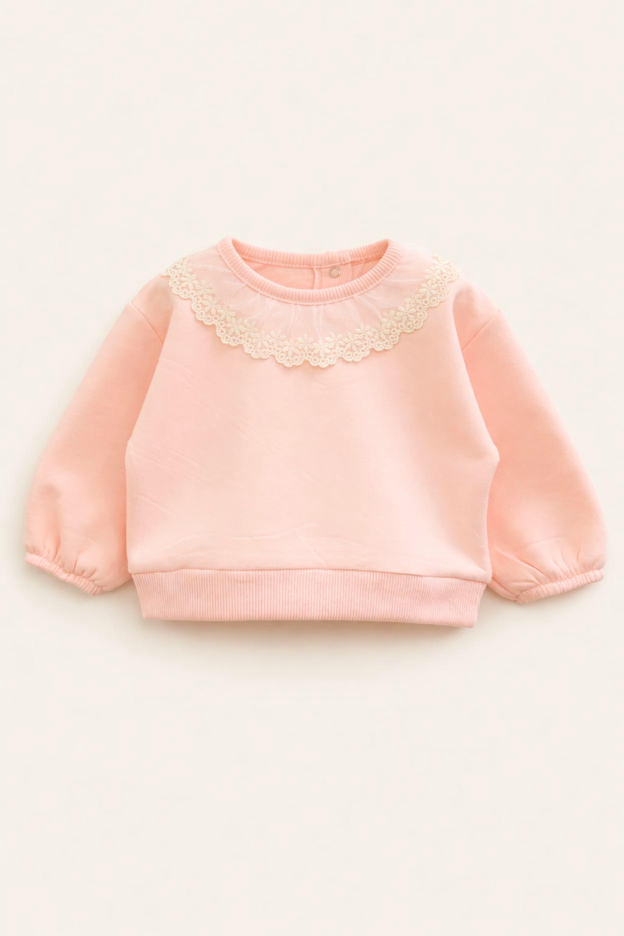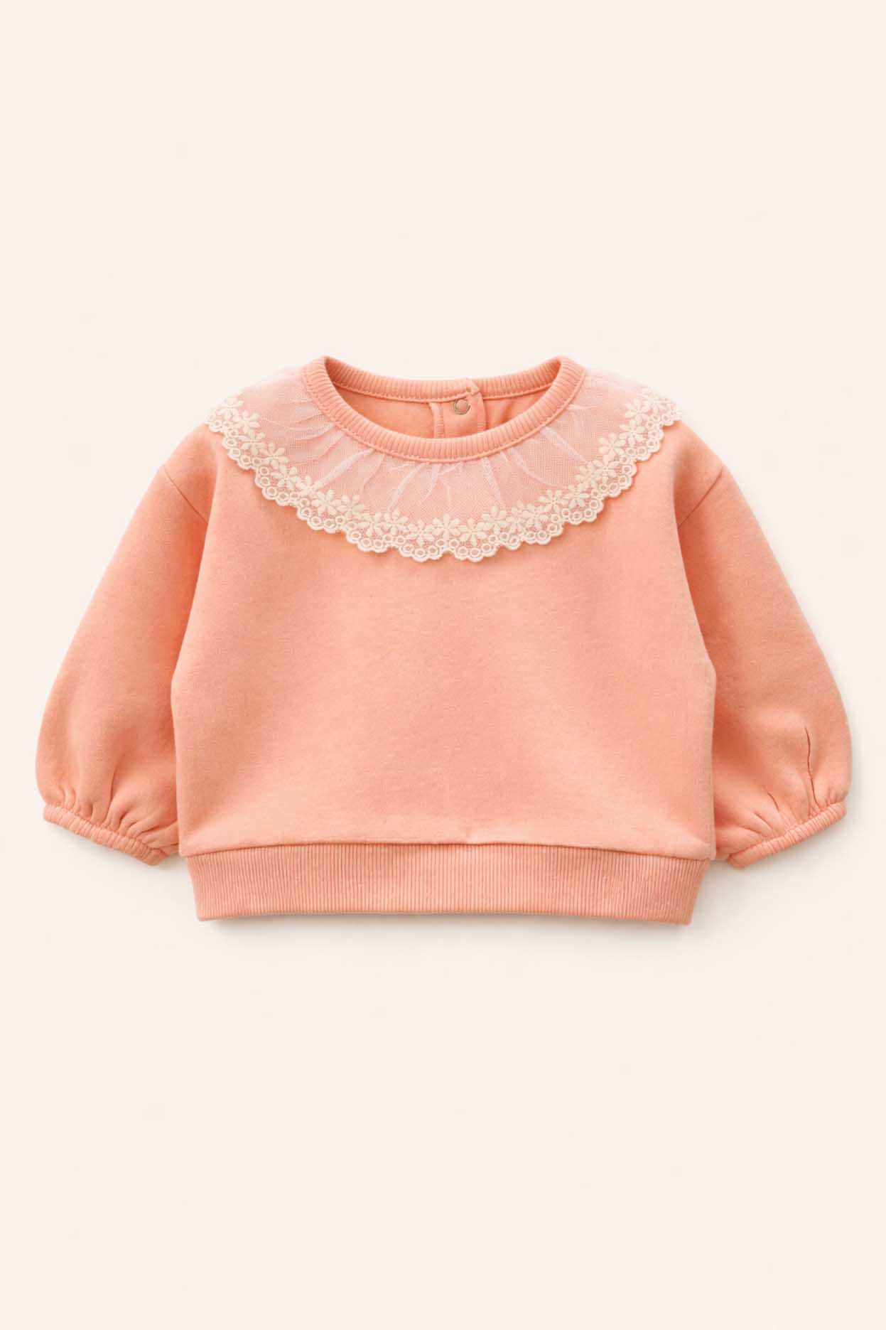 Este encantador buzo presenta un broche metálico en el cuello para facilitar el cambio, y una puntilla de tul bordada en los hombros que le da un toque de elegancia y ternura. Sus mangas largas lo convierten en una prenda ideal para mantener abrigada a tu pequeña en los días frescos.