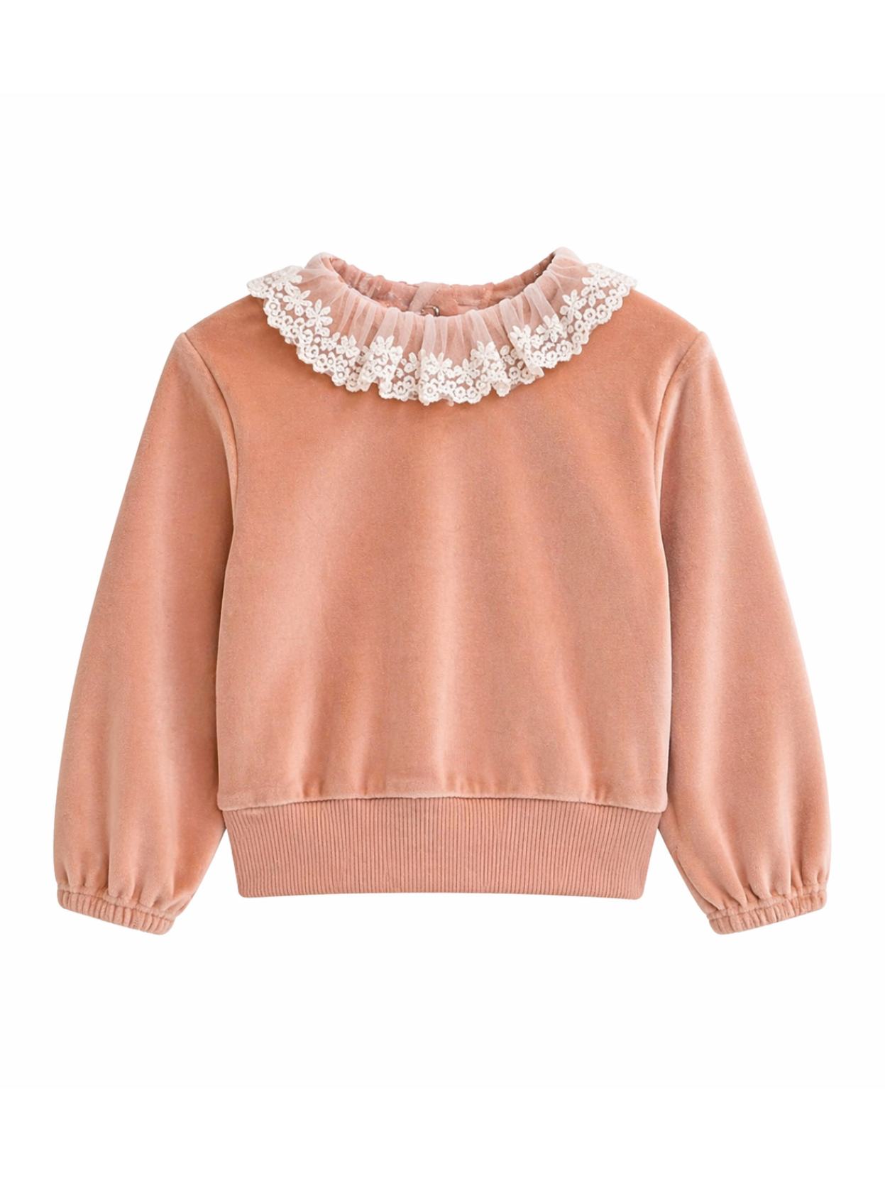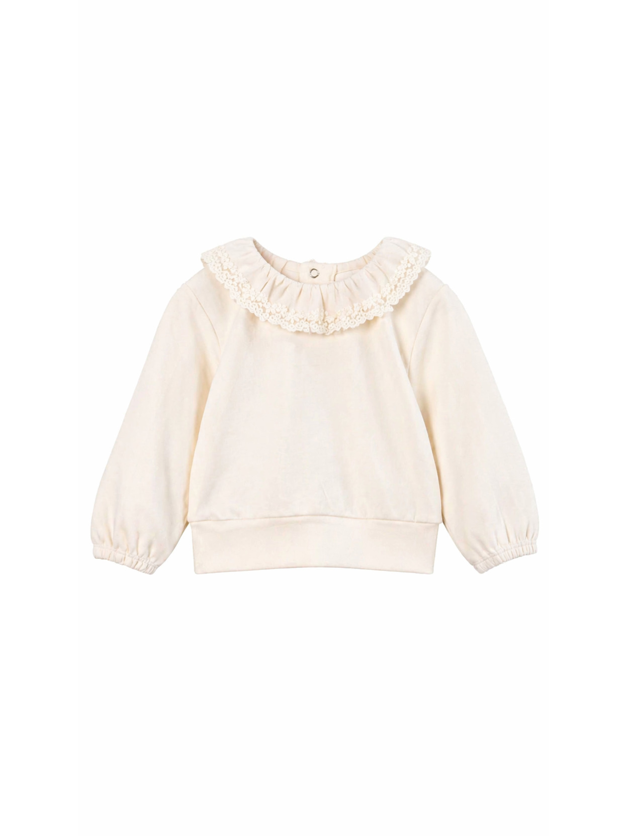 Este modelo se destaca por su diseño encantador, con un cuellito de puntilla que suma un detalle dulce y elegante. Además, cuenta con elástico en los puños para un mejor ajuste y dos broches metálicos en el cuello que facilitan el cambio, haciendo que el buzo de beba Malena sea práctico para el uso diario.