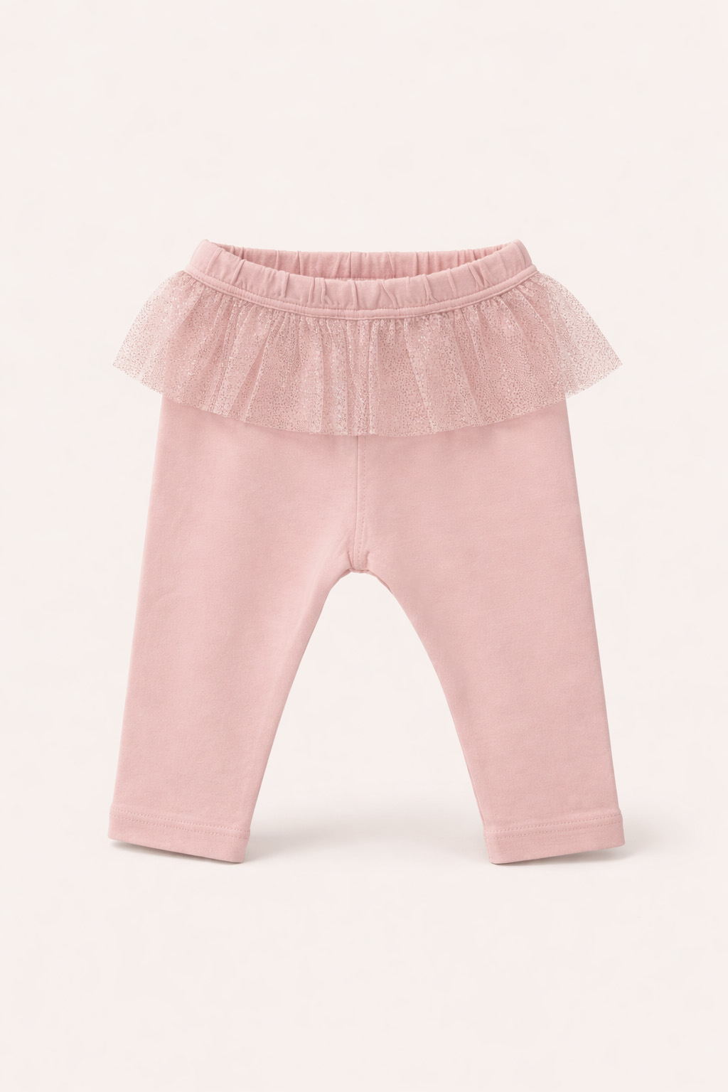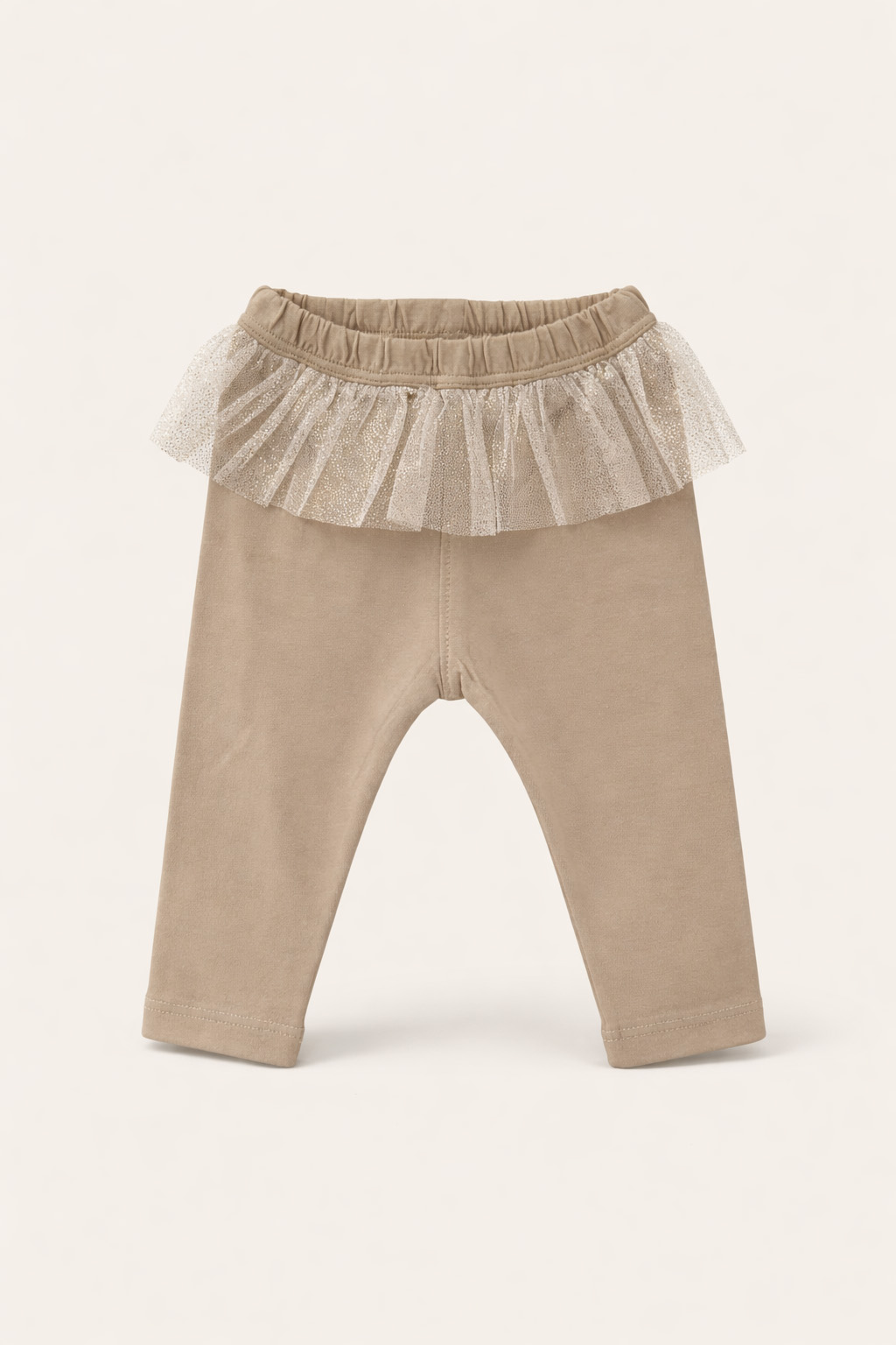 Calza de beba modelo Lucy, confeccionada en suave jersey de algodón elastizado de calidad premium, con delicado volado de tul con glitter brilloso que aporta un detalle femenino, alegre y especial a la prenda.