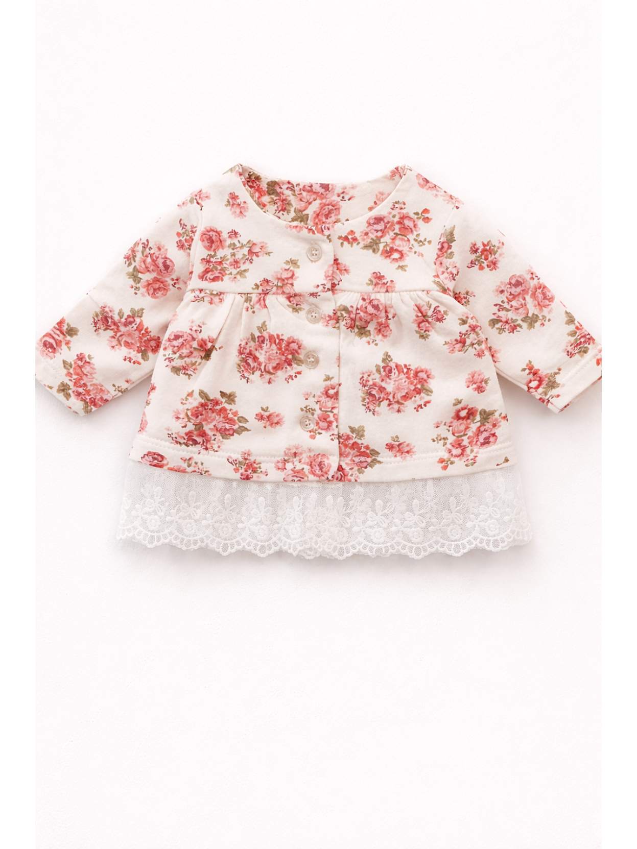 Este modelo cuenta con un encantador estampado floral que aporta un toque dulce y femenino. Además, presenta puntilla de tul bordada en los hombros que resalta su diseño único. Gracias a su manga larga, la campera de beba Rose es perfecta para mantener a tu bebé abrigada durante las temporadas más frescas.