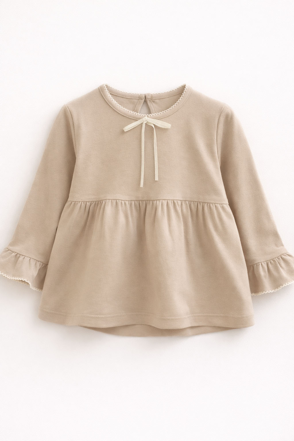 Este modelo incorpora detalles de bordado estilo picot en mangas y cuello, que aportan una terminación sutil y femenina. En el centro del cuello presenta un moño que suma un detalle delicado a la prenda.